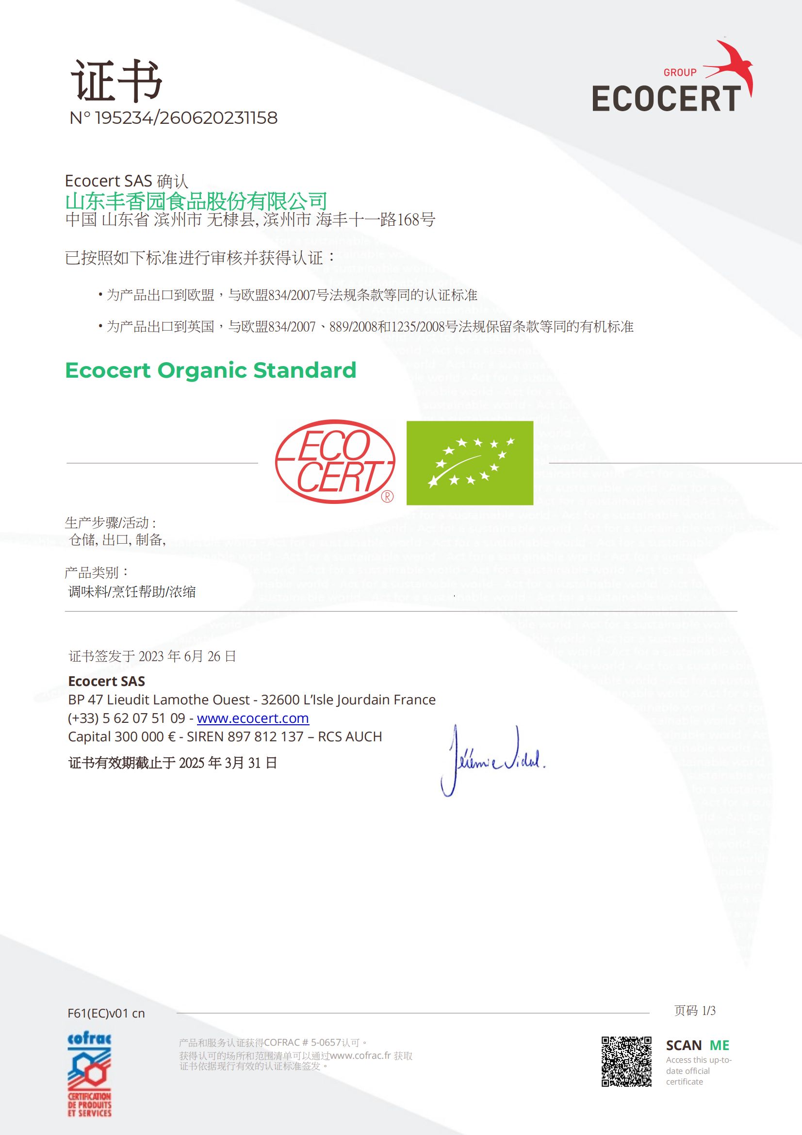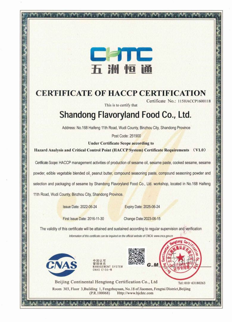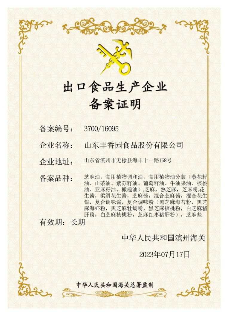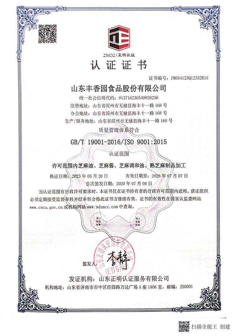 ? ? 豐香園小磨香油、芝麻調(diào)和油、花生醬、芝麻醬、混合醬、熟芝麻制品均已通過(guò)英國(guó)零售商協(xié)會(huì)BRC認(rèn)證、歐盟 美國(guó)和國(guó)內(nèi)有機(jī)、HACCP體系認(rèn)證,是山東省出口食品備案企業(yè)。